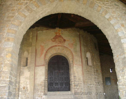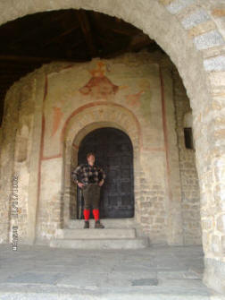 Durch ein Fenster werfen wir einen Blick ins relativ schmucklose Innere; irgendwo da drinnen müssten schöne Stukkaturen zu sehen sein.... Die Fresken am Portal entschädigen uns ein wenig, und der Blick in die Weite, den man von hier oben hat, ist sicherlich auch nicht zu verachten.