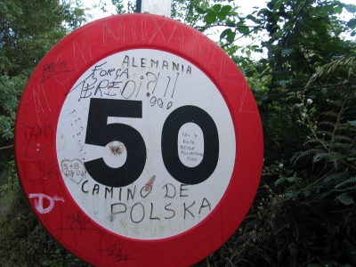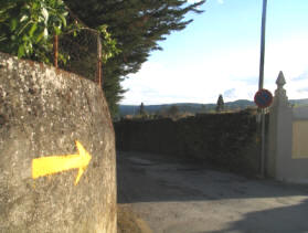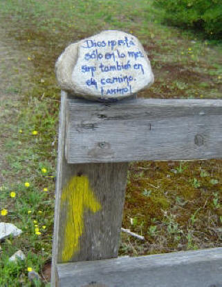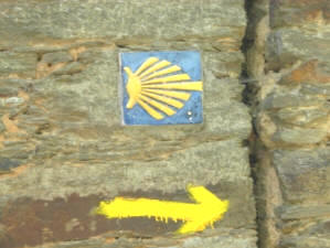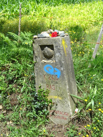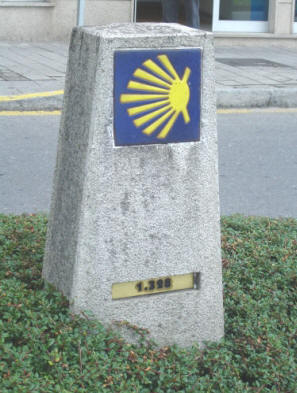 links: Camino-Kilometerstein - noch 96 km bis zum Grab des Heiligen Jakobus...