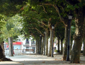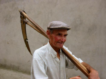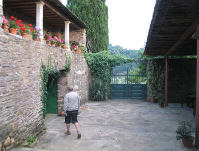 Heute ist Portomarin ein hübsches, aber eher schläfriges Örtchen, obwohl im Hochsommer einige Touristen kommen, von den Pilgern ganz zu schweigen. Der Stausee wird im Sommer von Booten befahren, es gibt Reitställe, und die guten Käse (tetilla - »Brüstchen«) sowie ein für den Ort typisches Backwerk verlocken zum Kaufen und Mitnehmen. Hervorragender Weißwein wird an den Ufern gebaut, Tresterschnaps daraus gebrannt, der bis vor kurzem verbotene Orujo.Die trutzige Kirche, in der wir uns gestern unseren Pilgerstempel geholt haben, steht mitten im irgendwie lieblichen Ortskern. - Nette, Blumen geschmückte Häuschen mit Arkaden vor ordentlichen Ladengeschäften, Bars und Restaurants, das alles gefällig drapiert rund um einen kleinen Dorfplatz mit dem imposanten Namen Plaza Mayor.