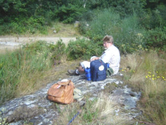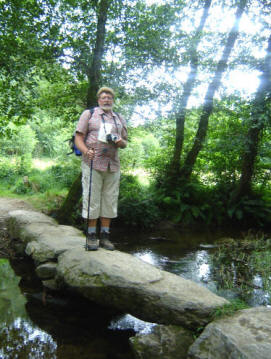 Auf der anderen Brückenseite scheint mir das Fotografieren noch interessanter. Also trete ich links vom Weg ins Gebüsch - doch da ist gar keins, mein Schritt zur Seite geht ins Leere, ja, ins Bodenlose. Während ich die Böschung kopfüber Richtung Fluss hinabstürze, denke ich nur: O Gott, der Fotoapparat! - und halte ihn krampfhaft hoch. Irgendwie, fast ist es ein Wunder, hält das – wie ich später feststelle, kurz vorher abgeschnittene, lose Grünzeug, das sich in Brombeerbüschen der Uferböschung verfängt, meinen Sturz ins Wasser auf. Mit dem Kopf nach unten bleibe ich in der steilen Böschung hängen. Günther stürzt herbei, reicht mir seinen Wanderstock, doch meine rechte Hand ist verstaucht, und ich kann nicht so fest zupacken, dass ich mich hochziehen könnte. Immerhin kann ich mich am Stock festhalten, bis Günther mich fassen und zu sich hochhiefen kann.
