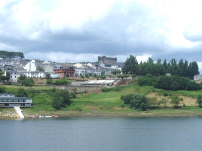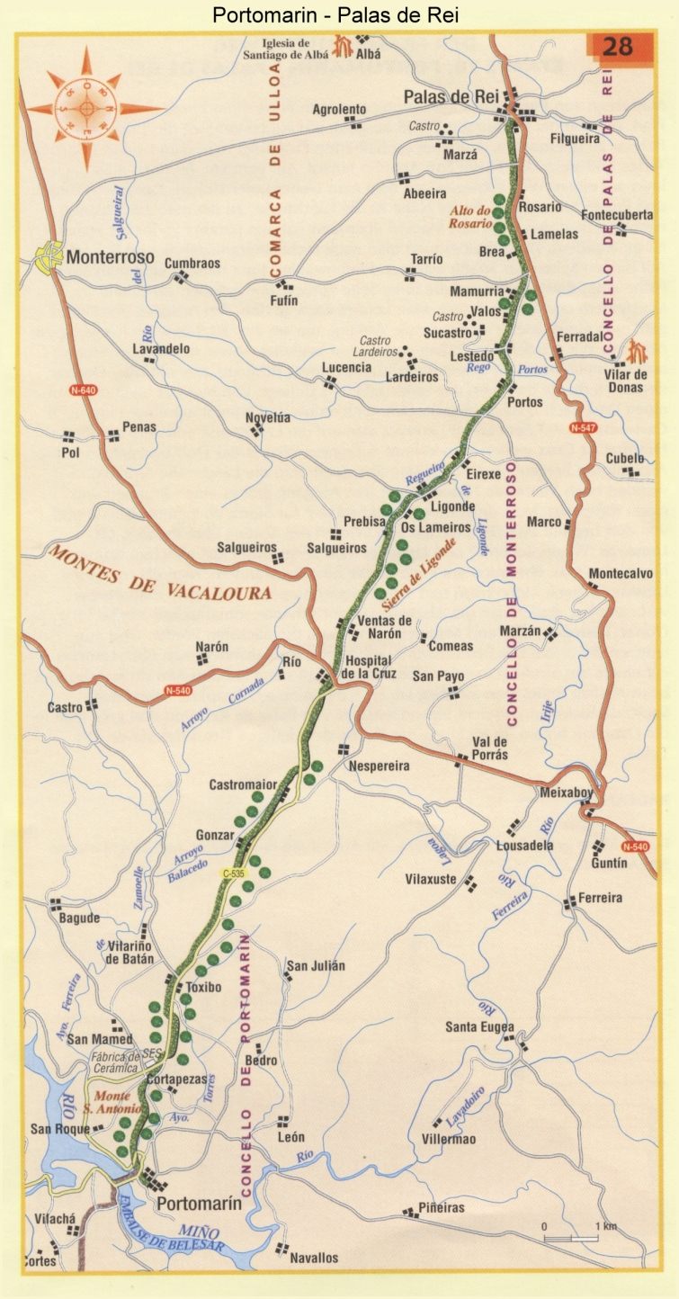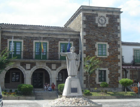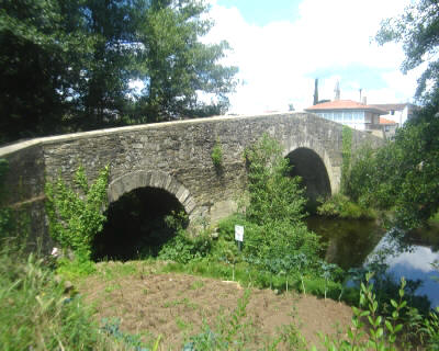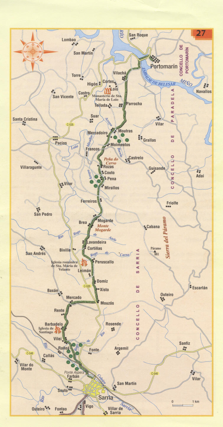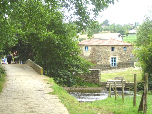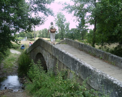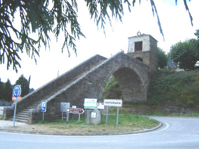 Portomarin - Die Wehrkirche San Nicolás (13. Jh.) gehörte dem Kreuzritterorden, der die Pilger auf ihrem Weg zum Grab des Apostels Jacobus beschützte. Sie beherrscht den Ort und hat - mit hochwertiger Bauplastik am Westportal - einen hohen künstlerischen und kunsthistorischen Wert, doch die Flussbrücke war das eigentlich bedeutende Baudenkmal des Ortes. Diese Brücke über den Minho bestand seit dem 12. J h. (um 1120), sie erleichterte den Verkehr zwischen den Flussufern, was für den Ort sehr wichtig war, da er sich zu beiden Seiten des Tales erstreckte, vor allem aber für die Pilger, die jetzt wesentlich leichter vorankamen als vorher. Drei Klöster hatte der Ort im Mittelalter und ein großes Hospital der Johanniter, eines der wichtigsten am Jakobsweg.