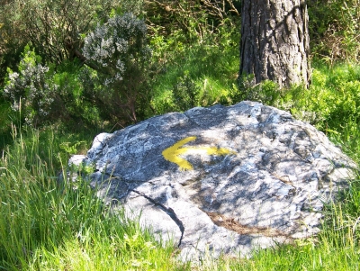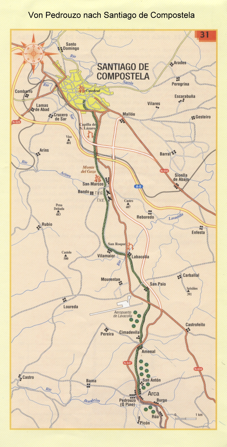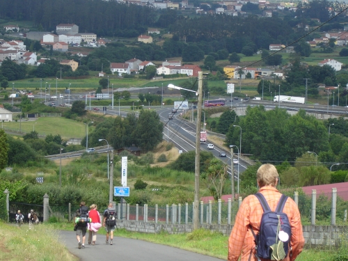 San Marcos ist ein altes Dorf, in dem man zum Besuch Papst Johannes Pauls II. im Jahre 1989 einen riesigen Pilgerkomplex baute, an dem wir wenig später vorüber wandern. Hier liegt auch ein weiterer Campingplatz: Camping Monte do Gozo, von dem man aber von der Straße aus wenig sieht.