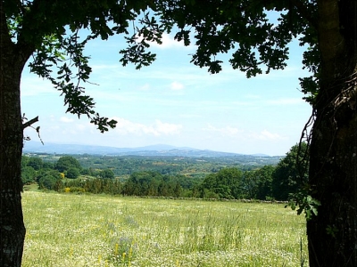 Der Weg durch den lichten Wald ist anfangs etwas steil, aber doch leicht zu bewältigen. Es dauert nicht lange, bis wir auf eine Ebene gelangen. Eine ländliche Gegend mit Wiesen und Feldern, gelegentlich kleinen Gehöften. Es ist still und friedlich.