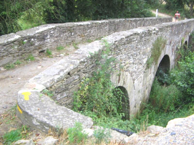 Wir gelangen bald an die romanische Brücke Puente Aspera über den Rio Celeiro, die natürlich fotografiert werden muss. Vor der Brücke passieren wir einige Arbeiter, die rechts und links des Weges das Unkraut und Gebüsch beschneiden. Darüber machen wir uns aber nach dem Überqueren der Brücke keine weiteren Gedanken….