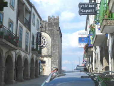 Die uns wenig ansprechende Kirche, die am oberen Ortsrand von Palas de Rei liegt, hat außer einem romanischen Portal nichts Nennenswertes aufzuweisen. Immerhin erhalten wir dort den letzten Stempel des Tages. Auf der Hauptstraße des Ortes angelangt, freuen wir uns, unseren Fury noch brav an der Stelle stehen zu sehen, wo wir ihn vorgestern geparkt hatten. Der Ort, den wir eilig durchqueren, hat trotz seines viel versprechenden Namens, wenig zu bieten. Nennenswert wäre höchstens eine kleine Pikanterie, die im mittelalterlichen Pilgerführer des Aimeric Picaud verzeichnet ist: Spätestens zwischen der »Miño‑Brücke in Portomarin) und Palas de Rei sollen Dirnen und Halsabschneider (die zum Teil sogar aus Santiago kamen) versucht haben, den erschöpften Pilgern das wohlbehütete Geld aus dem Beutel zu locken.