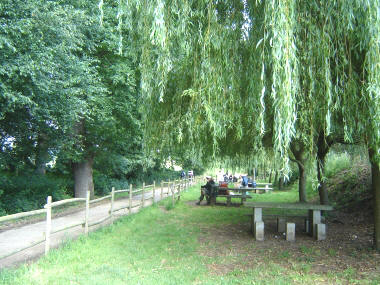 Nach knapp 20 Minuten erreichen wir eine weite Hochebene. Kurz vor dem Dorf Gonzar kommen wir an einem schönen Picknickplatz mit Brunnen unter mächtigen Trauerweiden vorüber. Für uns ist es noch viel zu früh für einen Imbiss, doch einige Pilgerkollegen sitzen hier bereits und futtern (vielleicht gab’ s ja bisher noch kein Frühstück).