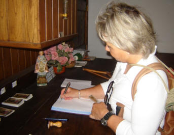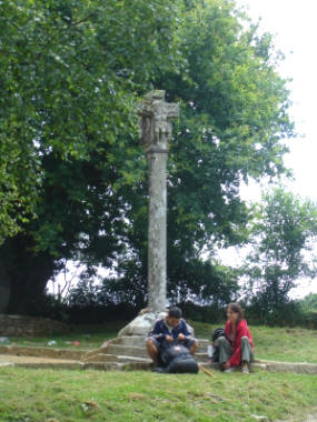 Dort steht auch die kleine St. Markus-Kapelle, die endlich einmal geöffnet ist. Wenigstens zum Schluss unserer Pilgerschaft können wir noch einmal einen Stempel von einem Kirchlein in unseren Pilgerpass setzen. An der Kapelle ist ein letzter Pilgertreffpunkt vor Santiago. Und so bleibt es nicht aus, dass auch wir auf „alte“ Bekannte stoßen: Die beiden netten jungen Leute, die uns immer wieder über den Weg laufen. Sie mussten gestern Abend noch 6 km bis Lavacolla laufen, um ein Quartier zu finden. Die beiden kommen übrigens aus dem Schwarzwald, heißen Gabriele – auch so ein Engel wie ich J, und Markus. Wir haben ihnen unsere Internetadresse genannt. Vielleicht schreiben sie uns ja mal ins Gästebuch.