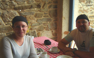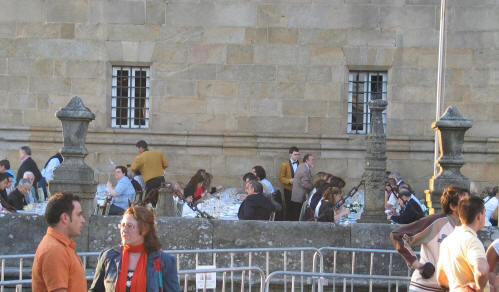 Wir wollen nun nur noch etwas essen und dann zurück zum Campingplatz - Füße hochlegen und relaxen, bevor wir heute Abend zum Feuerwerk auf der Plaza de Obradeiro aufbrechen. Auf dem Platz hinter der Kathedrale finden wir eine Crêperie, wo wir eine leckere Crêpe verspeisen und uns in den Pilgerführer vertiefen, um mehr über Santiago de Compostela zu erfahren.