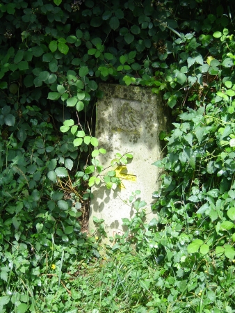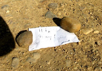Wir hatten Glück, die Wanderung kann weitergehen. Nach einigen Metern kommen wir an einem Verkehrschild vorüber, das wie die meisten an diesem Weg mit Parolen u.a. beschmiert ist. Bisher habe ich diesen Graffities keine Beachtung geschenkt, doch bei diesem Schild schaue ich zufällig (?) zum ersten Mal genau hin und lese: