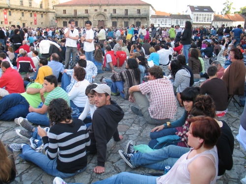 Recht hat sie, man wird müde beim Zuhören, zumal man kein Wort versteht, wenn man des Spanischen nicht mächtig ist. Mir fällt ein, dass man für die vielen Pilger und Touristen aus aller Welt doch den Wortlaut der Reden in Englisch über die aufgebauten Großbildschirme des spanischen Fernsehens laufen lassen könnte.
