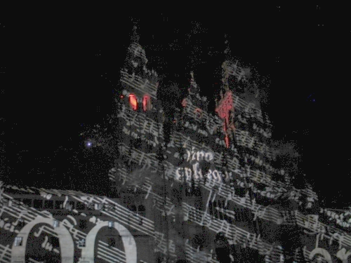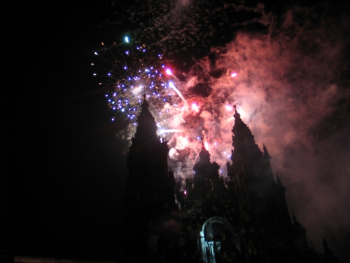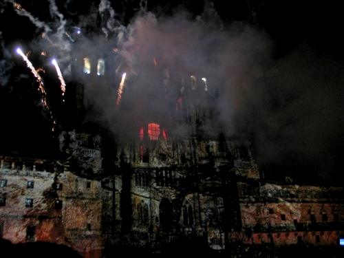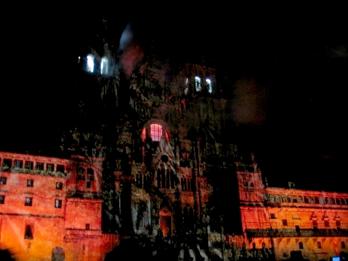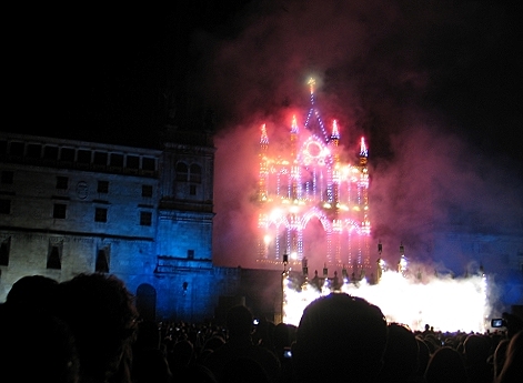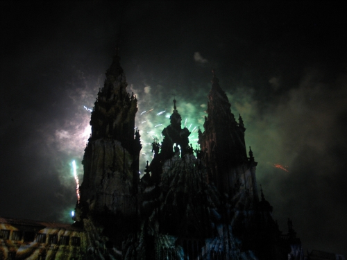 Das Feuerwerk übertrifft die kühnsten Erwartungen, es ist unglaublich schön. Lichteffekte auf der Kathedrale (die Jakobsmuschel, ein Blätterwald, Fassaden anderer Kathedralen dieser Welt – z.B. von der in Siena, Schriftzüge, die über die Fassade wandern, oder die Fassade der Kathedrale selbst in einer Art Skizze), Feuerwerk und Musik harmonieren so gekonnt, es ist ein atemberaubendes Meisterwerk.