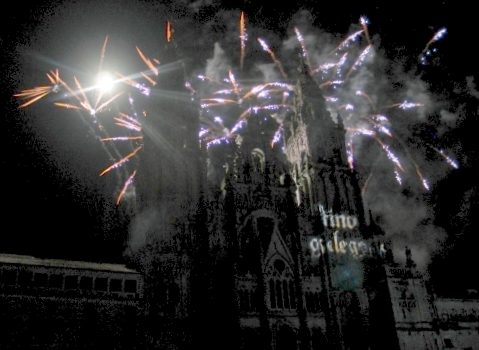 Dieses wunderbare Gespräch verkürzt uns allen die Wartezeit bis zum Beginn des Feuerwerks, dessen Startböller erst um 23.30 Uhr ertönt. Inzwischen stehen die Menschen auf dem Platz Kopf an Kopf. In dem wunderschönen Hotel …., das links von der Kathedrale steht, sitzen die teuer gekleideten Gäste an edelst gedeckten Tischen und speisen. Vermutlich zu astronomischen Preisen. Möchten wir mit ihnen tauschen? Im Leben nicht!