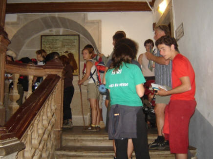 Im Bus lernen wir eine 4-köpfige Familie aus Deutschland kennen, die gerade nach Sarrià unterwegs sind, um auf Pilgerschaft zu gehen. Die ca. 14-jährige Tochter, mit MP3-Player und Ohrhörern versehen, schaut muffelnd vor sich hin, der vermutlich 2 Jahre jüngere Bruder sieht eher gleichmütig aus. Auf meine erstaunte Frage, ob die Kinder die Wanderung denn ohne Murren mitmachen würden, wirft die Mutter nur einen kurzen Blick auf ihre Tochter, hebt eine Augenbraue und antwortet in einem Kurzsatz: Zum Teil. Ich muss grinsen. Pubertierende Kinder sind halt anstrengend. Kann man nur hoffen, dass die Tochter in den Albergues nette Jungs kennen lernt. Dann wird sie umgehend zum glühenden Fan des Jakobsweges werden. So sinse, die Pänz…