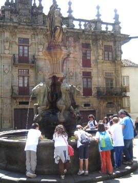 Als nächstes wollen wir uns natürlich das Ziel unserer Pilgerreise ansehen: die Kathedrale von Santiago de Compostela mit dem Grab des Apostels Jakobus. Auf dem Weg dort hin bewundern wir auf der Plaza de las Platerias (Foto unten) die Fuente de los Caballos, den Brunnen im Zentrum des Platzes, die Casa del Cabildo aus dem 18. Jahrhundert und die Casa de los Canónigos, Conga genannt, ein Palast der ebenfalls aus dem 18. Jahrhundert stammt.