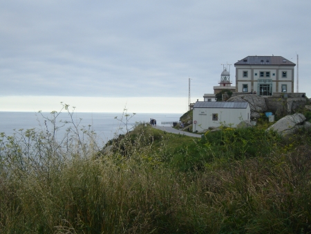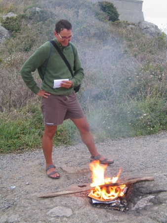 Rechts vom Faro setzen wir uns in luftiger Höhe über dem Meer auf die mit Heidekraut bewachsenen Felsen und harren des Sonnenuntergangs, der sich heute jedoch vermutlich hinter Wolken abspielen wird. Geduldig sitzen wir dort auf unserem Hochsitz, bis nach halb zehn, ahnen nur, wo die Sonne ist, ahnen, dass sie jetzt bald untergehen wird, und werfen dann das Handtuch. Das wird heute nix. Es ist trotzdem schön und außerdem bekommen wir zwischendurch auf unserem „Hochsitz“ Besuch von zwei Pilgern und dürfen das feierliche Verbrennen eines Pilgerhuts und -stocks miterleben. Die tiefgründige Symbolik dieser Handlung ist ja sehr beeindruckend, aber leider nichts für uns. – Wir sind zu wenig gepilgert, brauchen unsere Wanderstöcke noch für die nächste (Pilger-????) Wanderung, und unsere neuen Wanderhüte sind sogar zum (öffentlichen) Verbrennen zu hässlich.