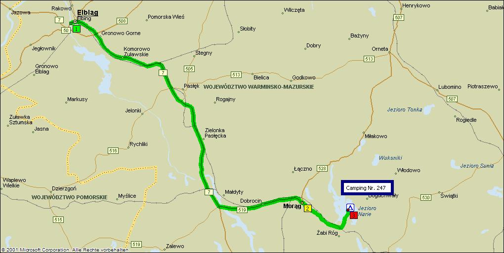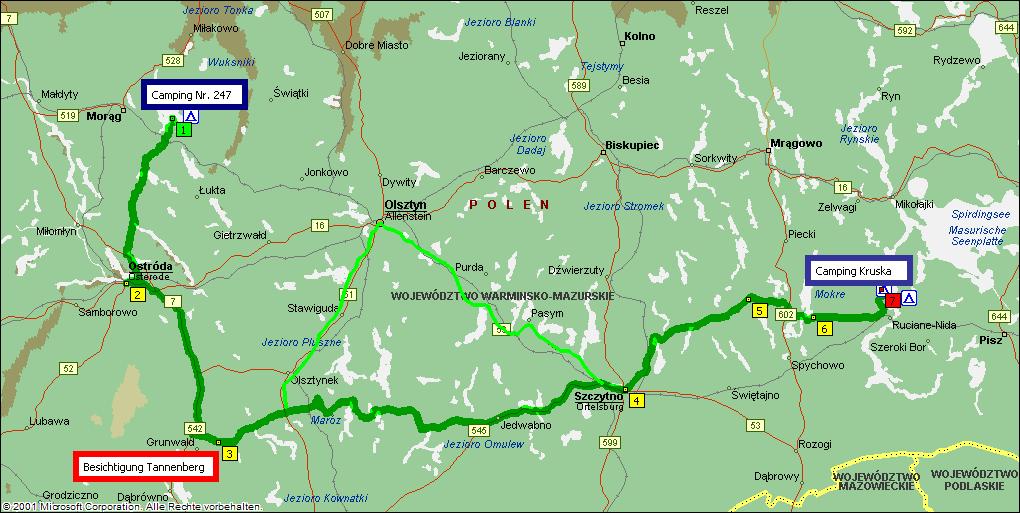 Heute haben wir eine größere Reiseetappe vor uns: Über Osterode, Stebark (Tannenberg), Olsztynek (Hohenstein), Szcytno (Ortelsburg), dann ein Stück durch die Johannisburger Heide (Pusczta Piska), vorbei am Jezioro Marksoby, durch die schönen Masurendörfer Babieta, Stare Kietbonki und Zgon bis nach Ruciane Nida am Beldany-See.