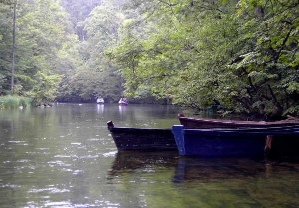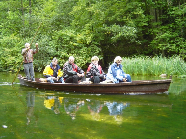 Sie tritt sogleich aus der Haustür, als wir mit unseren knatternden Gefährten vor dem Haus Nr. 8 anhalten. Auf den ersten Blick weiß man, dass diese Frau ein wirkliches Original ist. Herzlich werden wir begrüßt und durch ihren Garten zum Fluss geführt. Dort liegen einige der flachen Boote bereit. Da wir nicht alle in einen Kahn passen, hat Cristina einen zweiten Bootsfahrer, Uli, angeheuert, der aber kein Deutsch spricht. Egal, das Sprechen übernimmt Cristina sowieso mit einer großen Lebendigkeit und einem anziehenden Humor. Übrigens: Ihr Sohn, der in Deutschland lebt, hat eine schöne Homepage erstellt mit Infos über die Krutynia, seine Schwiegermutter und die kleine Pension, die die Familie betreibt.