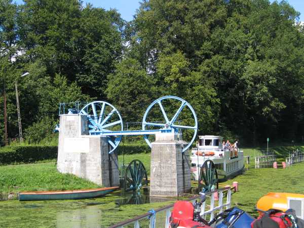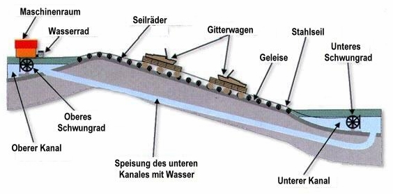 Die Hauptattraktion ist das in der Welt einzige funktionierende Rampensystem. Die einzelnen Rampen bringen die Schiffe auf dem Lande je nach Fahrtrichtung nach oben oder unten. Die Wasserspiegel-Differenz ändert sich auf einer Länge von 9,6 km um über 100 m, die das Schiff mit Hilfe der fünf mit Wasser angetriebenen Rampen überwindet.