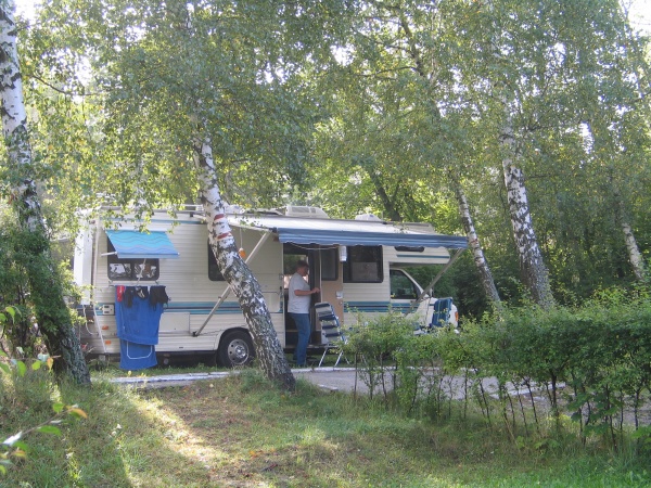 Gegen Mittag sind wir am Kretowiny Camping Nr. 247. Der Platz liegt direkt am See, aber unsere Dickschiff-Kapitäne wollen das Risiko nicht eingehen, unter einigen tief hängenden Ästen durchzufahren, um an die Seeplätze zu gelangen. Günther macht das nichts aus, und so stehen wir direkt am See, den wir durch eine niedrige Hecke blitzen sehen. Die Hecke müsste weg...