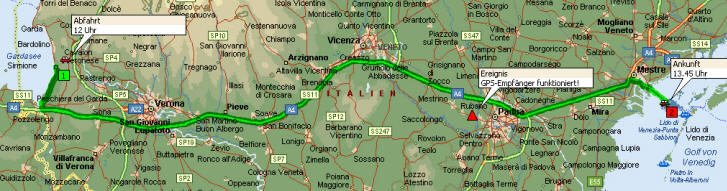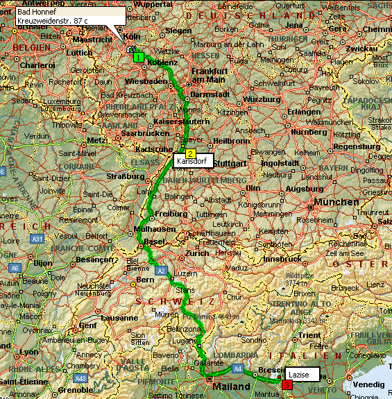 Route 1: Bad Honnef - Karlsdorf - Lazise /Gardasee (zum Vergrößern: anklicken)