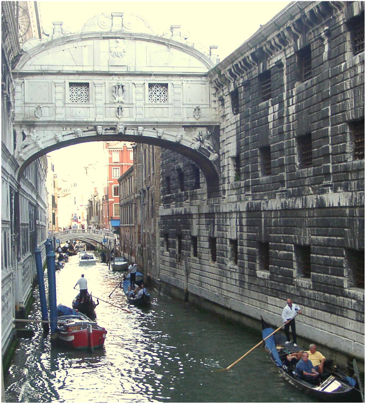 Die berühmte Seufzerbrücke, die den Palast mit dem öffentlichen Gefängnis verbindet, befindet sich hinter dem Dogenpalast. Gefangene mussten sie auf dem Weg vom und zum Gerichtssaal überqueren.
