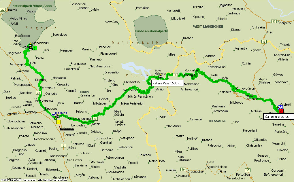 Die Straße schlängelt sich durch eine Gebirgswelt, die uns erahnen lässt, welche Naturschönheiten uns noch erwarten. Es geht steil und kurvenreich bergan,  imposante Blicke hinunter in das unter uns liegende Land wechseln sich ab mit Ausblicken auf die vor uns liegenden Berge des Pindos-Gebirges, das die Landschaften Thessalien und Epirus trennt. Der Pindos erstreckt sich von der Grenze Albaniens aus etwa 160 Kilometer nach Süden und erreicht eine Höhe von 2 480 Metern. Die Pindos-Gebirgskette zählt zu den wundervollsten aber dennoch weithin unbekannten Bergregionen Europas. Sie umarmt zwei Nationalparks, den von der Schlucht Vikos-Aoos und den Naturpark von Walia Kalda. Die einzige bedeutende Straße in ostwestlicher Richtung führt über den Katarapass, den auch wir auf unserer Fahrt zur Chalkidike überqueren müssen.