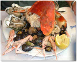 Wir entdecken auf der Hafenmole auch  einen sehr schönen Wohnmobilstellplatz, der allerdings ziemlich windig gelegen ist. Die Entdeckung eines Speiserestaurants, das allen Bedürfnissen der RMC-Truppe Genüge tun kann, ist jedoch eine etwas schwierigere Sache. Nach längerem Umherirren durch die Gassen Roscoffs entscheiden wir uns für ein Lokal am Hafen, das jede Menge Fischiges zu kredenzen verspricht, aber nicht nach demselben riecht... Man vertieft sich in die Karte, wählt vertrauensvoll, bestellt - französisch-englisch-italienisch-spanisch-deutsch radebrechend, diskutiert mit dem Kellner wiederholt die Frage der Abrechnung und wartet dann geduldig auf Speis‘ und Trank. Trank ist okay, Speis‘ diffizil, Situationskomik inklusive (s.u.) ....