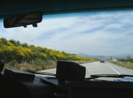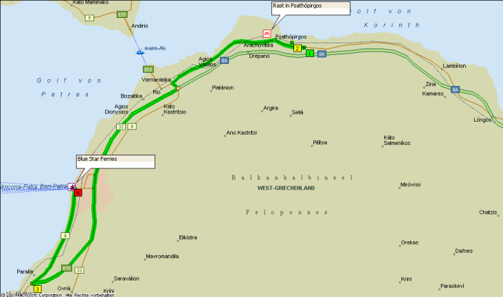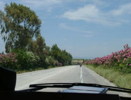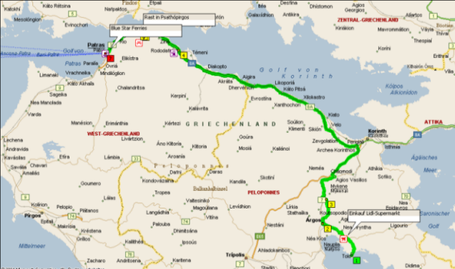 Eine wunderschöne Wegstrecke liegt nun vor uns; wir fahren am Golf von Korinth entlang. Immer wieder hat man herrliche Ausblicke auf das Meer, und entlang der Autobahn wird dem Auge eine schöne Bepflanzung mit Oleander geboten. Wo diese einmal fehlt, springt die natürliche Vegetation des Landes ein mit leuchtendgelb blühenden Ginsterbüschen.