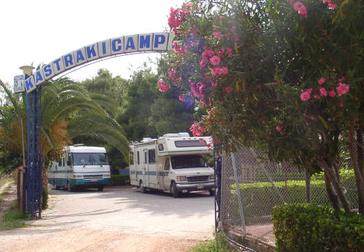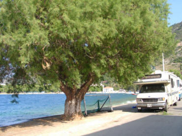 Bei Rio / Kato verlassen wir die Autobahn, um auf die Küstenstraße zu fahren. Nirgendwo entdecken wir ein schönes Plätzchen für unsere Rast. Die Stimmung wird langsam explosiv. Plötzlich schallt es aus dem Äther: „Wollt ihr noch bis Korinth? Ich fahre jetzt jedenfalls zurück und stelle mich an den Hafen!“ Günther beruhigt unseren Hardy: „Wir finden gleich was.“ Dein Wort in Gottes Gehörgang, denke ich, aber mein Gatte hat wohl einen Draht nach oben. – In Psathópirgos, dem nächsten Ort, finden wir rechts der Straße tatsächlich einen schönen und ruhigen Stellplatz direkt am Meer, wo wir die nun unfreiwillig stark verkürzte Wartezeit verbringen können. Der schon in Tolo vorbereitete Bohnenauflauf wird gewärmt und - etwas behelfs-mäßig auf unseren Hockern sitzend und die Teller auf den Knien balancierend - vor dem Wohnmobil im Sonnenschein mit höchstem Genuss verspeist. Bequem ist das eher nicht, aber mein Gemahl bringt es auf den Punkt: Wir sind eben Draußenmenschen.