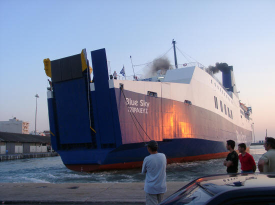 So kommen wir schon viel zu früh im Hafen von Patras an. Die Männer fragen beim Fährbüro nach, aber der Schalter von Blue Star Ferries ist noch nicht besetzt (angeblich erst ab 20 Uhr). Im Hafen ist es tierisch laut und heiß, kein Lüftchen geht, hier wollen wir eigentlich nicht unsere letzten Stunden auf griechischem Boden verbringen. Kurze Lagebesprechung. Wir fahren noch einmal die Küstenstraße entlang und suchen uns ein Plätzchen, wo wir die Wartezeit angenehmer gestalten können.