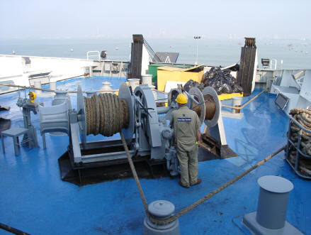 Unsere Matrosen bereiten die Landung vor: Die Rampe am Schiffsbug wird herunter gelassen.